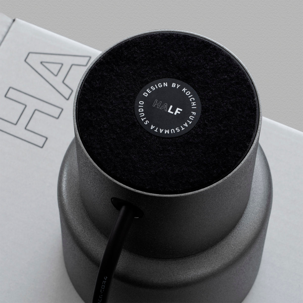 2024年にプロトタイプとして発表した「HALF」は、住空間のためにデザインされた壁付け照明を、より身近なプロダクトとして再構築したテーブルランプで、ガラス製のボール球の素朴でアノニマスな美しさを造形に取り入れています。